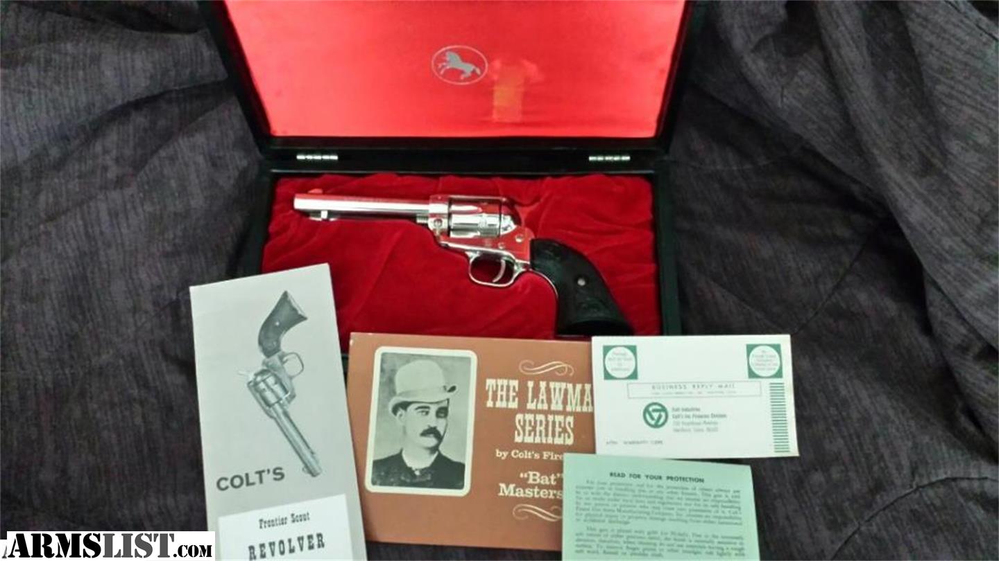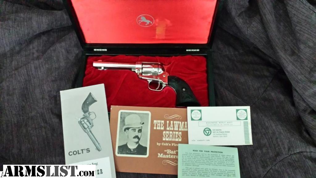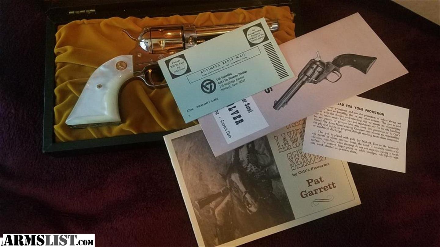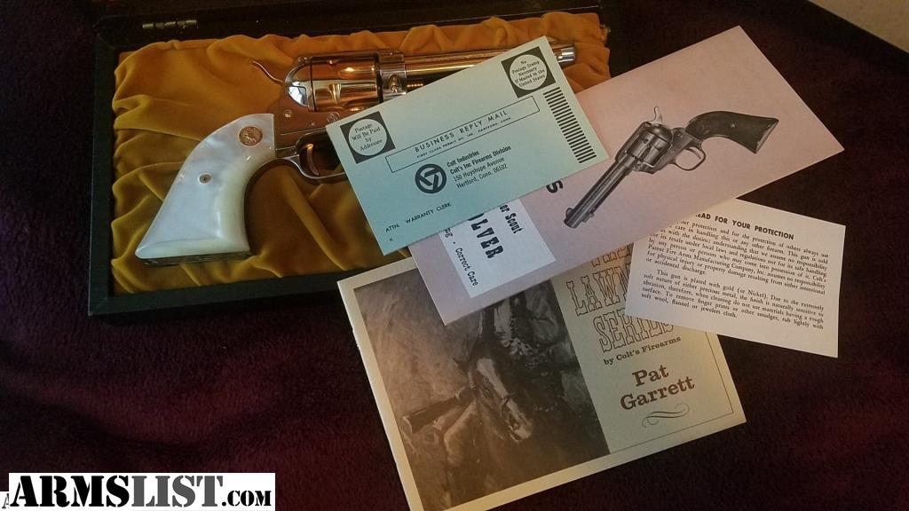 Pat Garrett, Bat Masterson, Wild Bill Hickok, and Wyatt Earp. .22 Lawman Series. Will not separate. These are 100% just like they came out of the factory; they all have original cases, paperwork, manuals, and keys. Pat Garrett has the cardboard box, also. Wyatt Earp's case is not pristine like the other 3 but unfired. These are not all the serialize to each other. I have other Colt collectibles, and nothing is under 99.5% to 100%. If I don't reply, it's probably a no. PU for free or shipping will be $125.00 if you want to insure them, probably more for shipping...TD Bank personal check or TD certified or personal could take up to 10 days if not a local bank. Pick up cash only, and will need to copy your ID and fill out a firearm bill of sale.