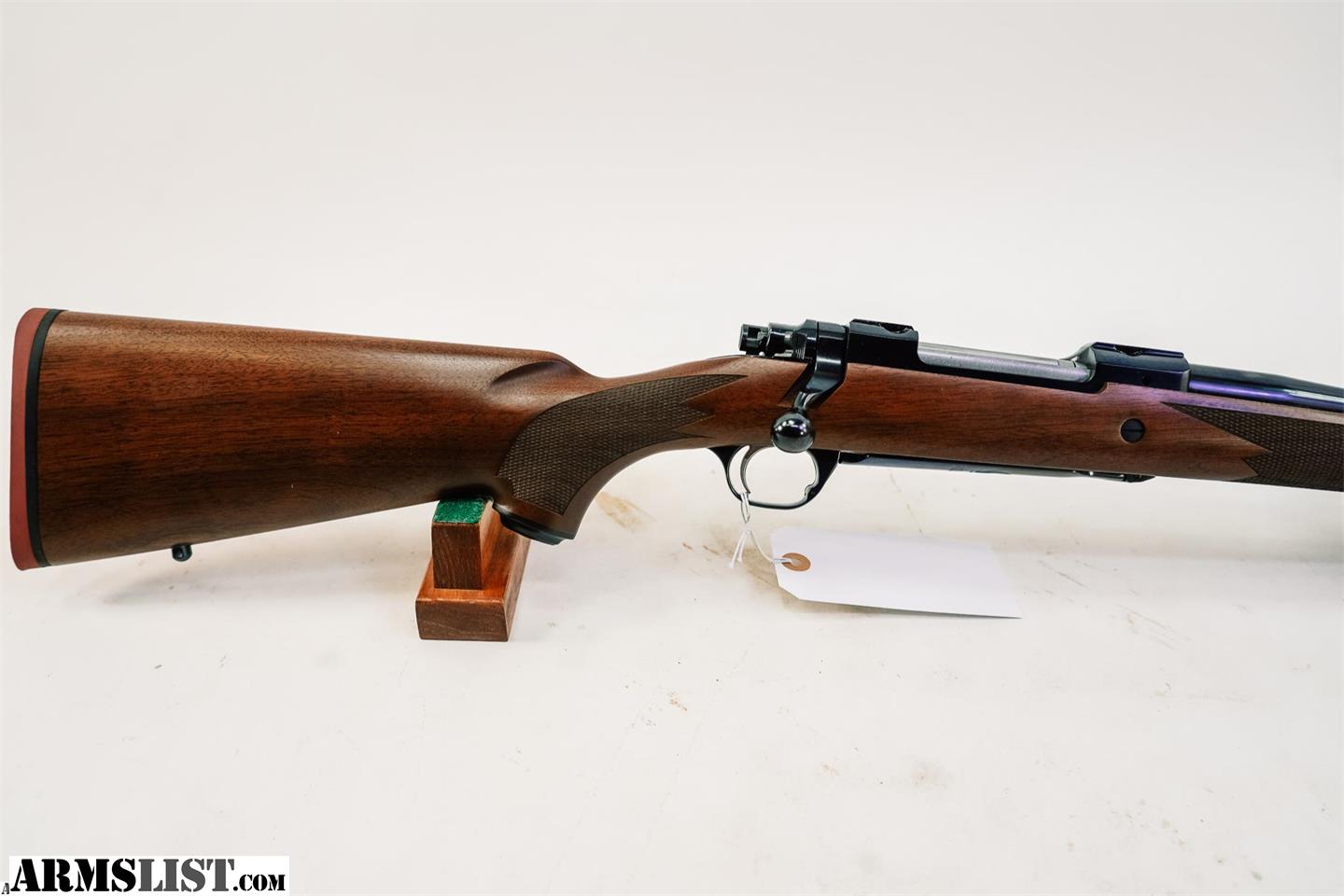 Additionally, this rifle features a barrel band with open sights, a blued bolt handle, and a red recoil pad for added comfort and control. The traditional checkered walnut stock provides a firm grip and classic aesthetic, making it a top choice for traditional rifle enthusiasts.
