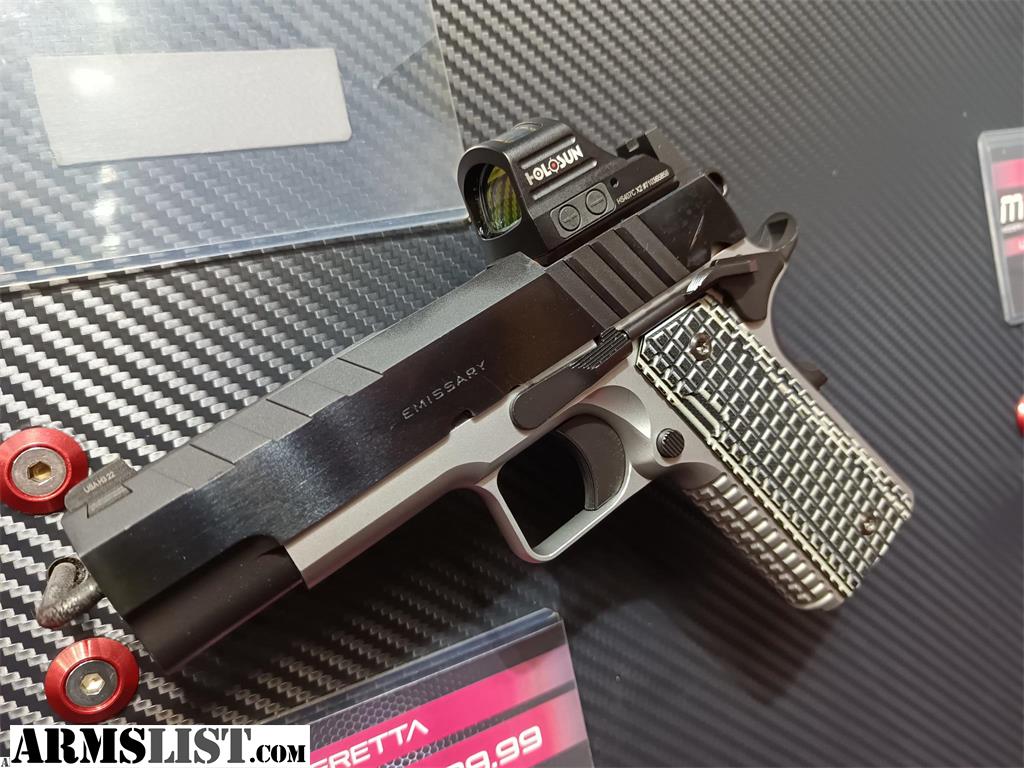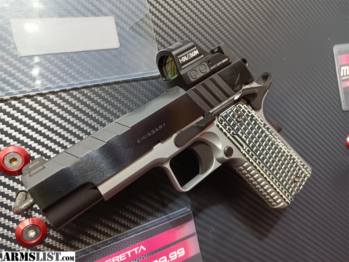 JUST RECEIVED A USED Springfield, Emissary, 1911, Single Action Only, Semi-automatic, Commander Size, 9MM WITH HOLOSUN RED DOT OPTIC 4.25 Match Grade Bull Barrel, Stainless Steel Frame and Carbon Steel Slide, Blued Finish, Black Slide, Silver Frame, VZ Grips Thin-Line G10, Manual Thumb Safety, Tritium/Luminescent Front Sight, Tactical Rack U-Notch Rear Sight, 9 Rounds, 2 Magazines