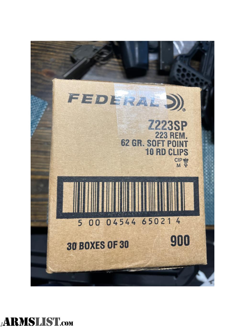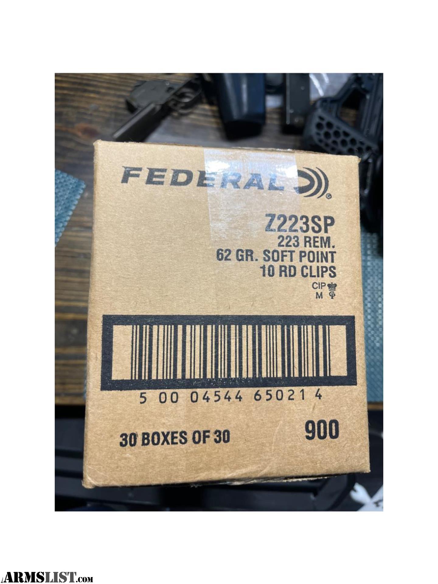 Full case, 900 round case of Federal .223 / 5.56 soft point ammo on stripper clips. Limited run! Great price for factory brass case ammo!