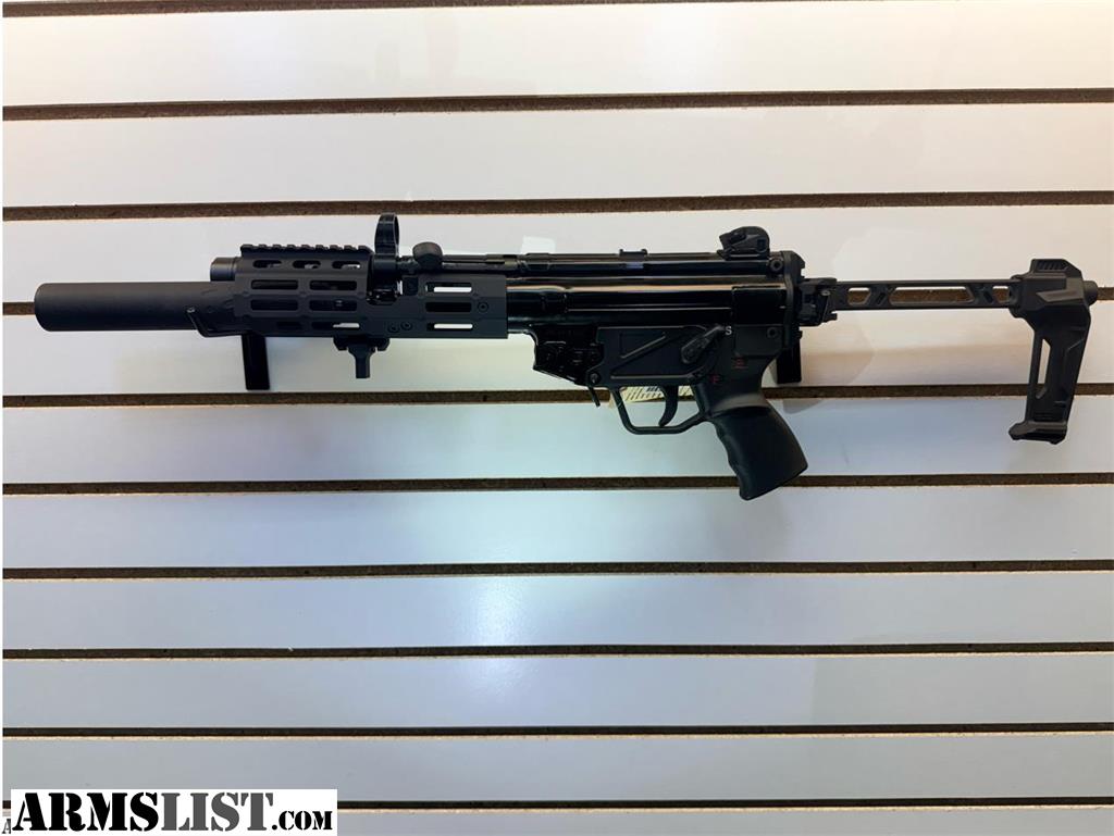 This MAC 5K is a custom build by our gunsmith. The brace included is a Strike Industries Dual Folding Picatinny Stock. A Midwest Industries MP5 M-LOK Suppressor Handguard. A ProTac Streamlight able to do solid light or storbe. Arisaka finger stop at the bottom attached to a picatinny rail. Attached to the end of the barrel is a Yankee Hill 9mm Sidewinder M2. This is all included into the price of the gun.