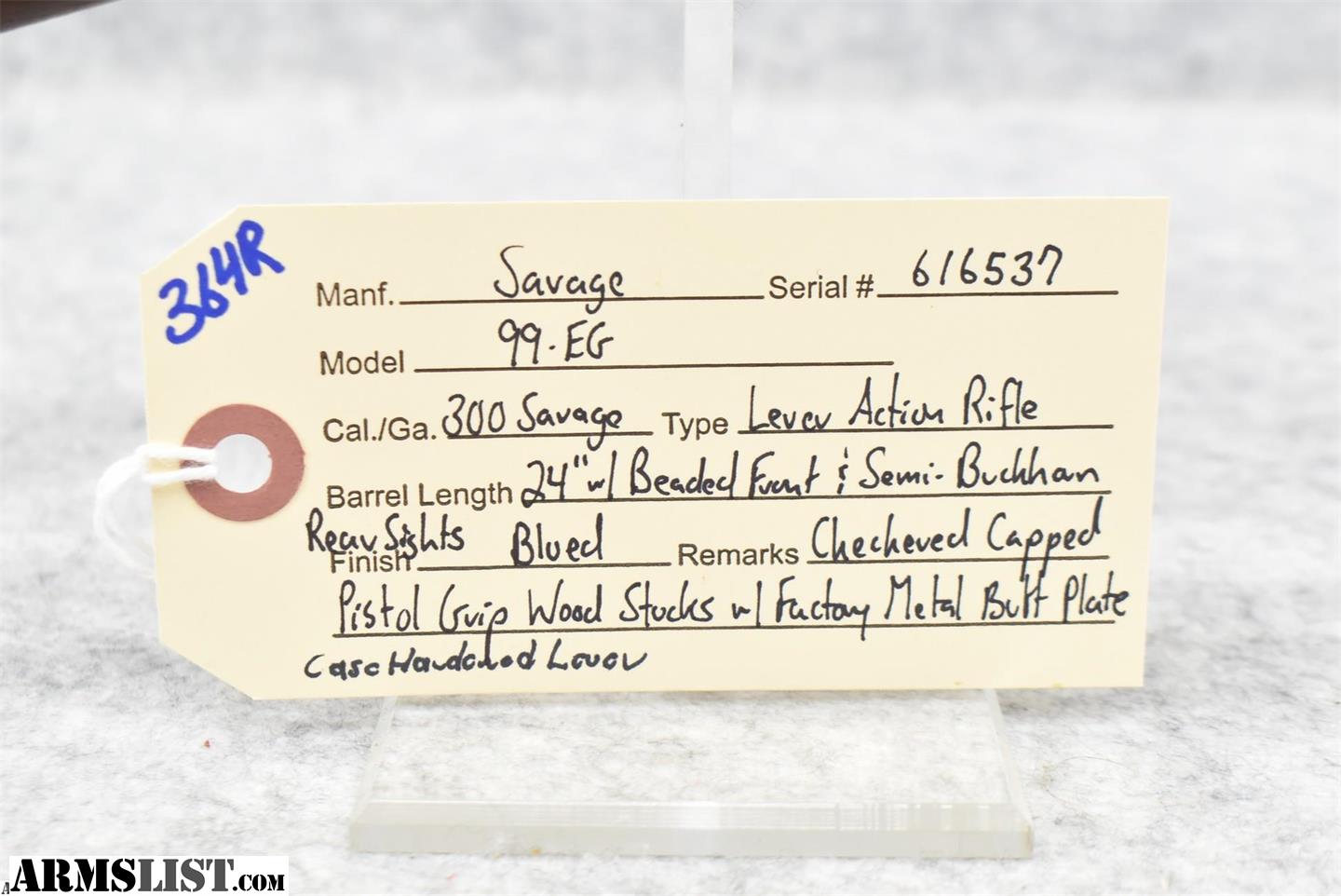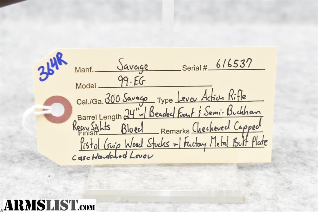 Savage – Mod. 99-EG – 300 Savage Cal. Lever Action Rifle – w/24” Barrel w/Beaded Front and Rear Semi-Buckhorn Sights – Blued Finish – w/Checkered Capped Pistol Grip Wood Stocks w/Factory Metal Butt Plate – w/Case-Hardened Lever