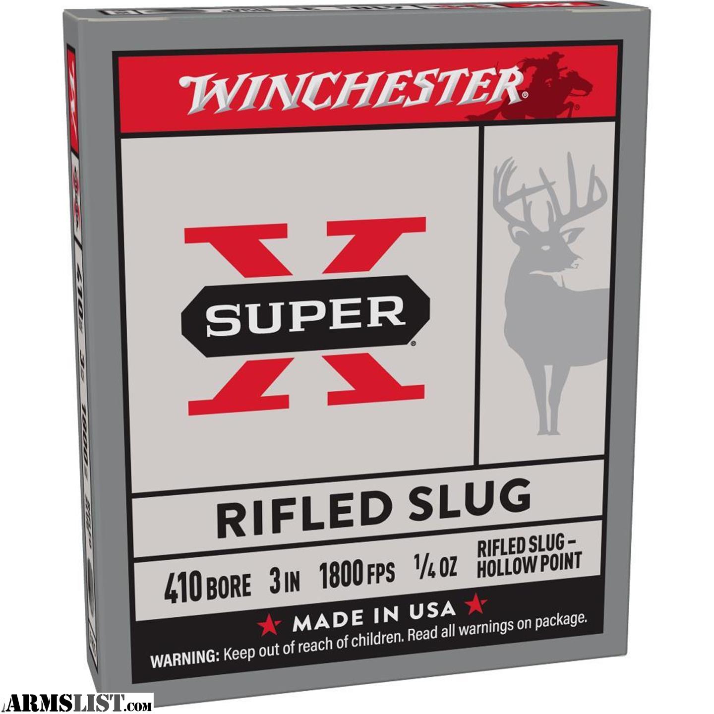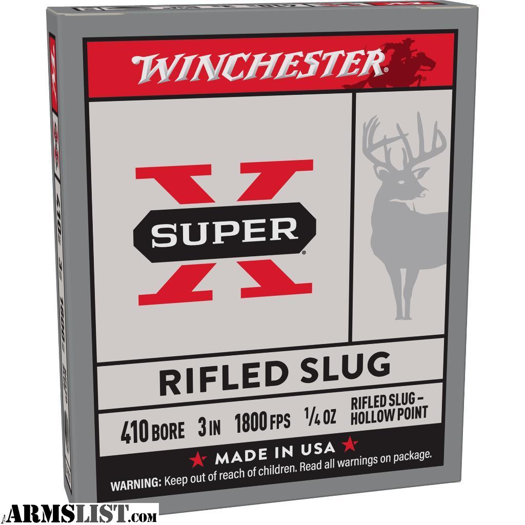 Winchester Ammunition Super-X? 410 Gauge? 3 Inch 1/4 Ounce? Rifled hollow point slug? 1,800 Feet per second? 5 Rounds per box?