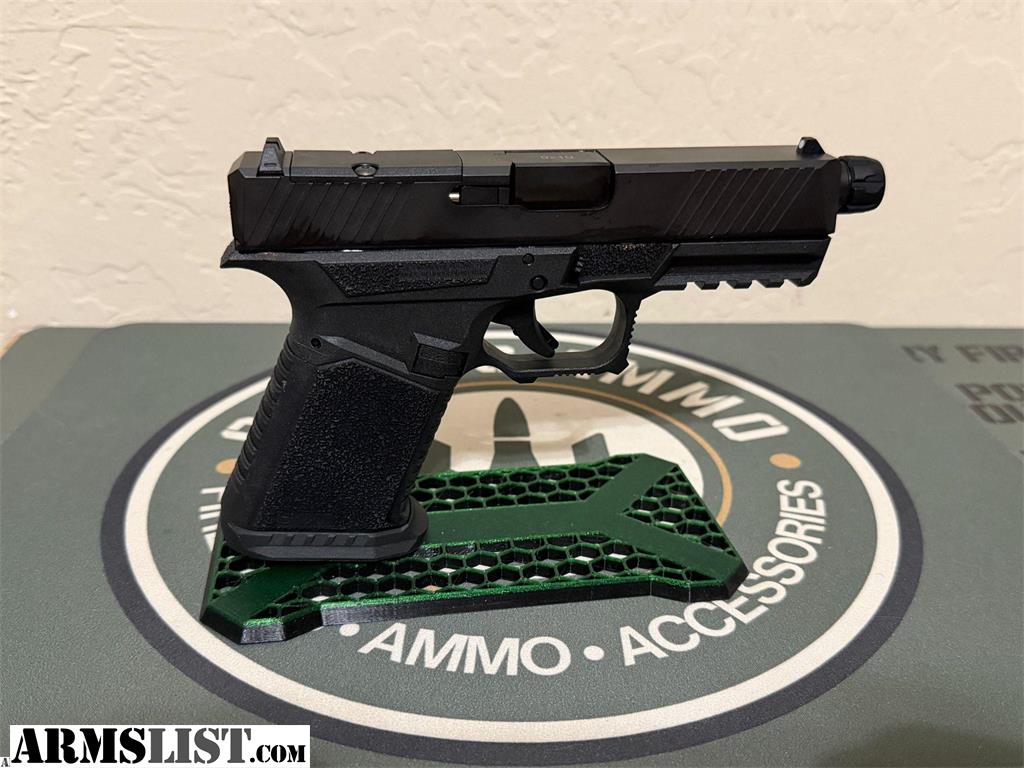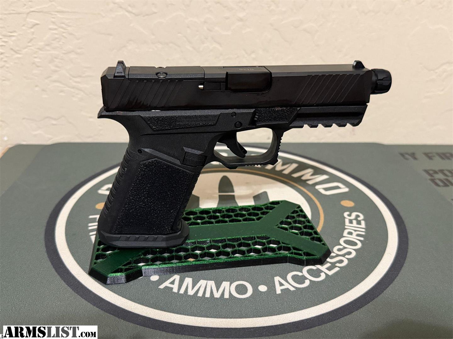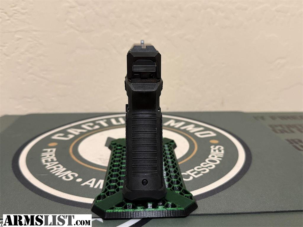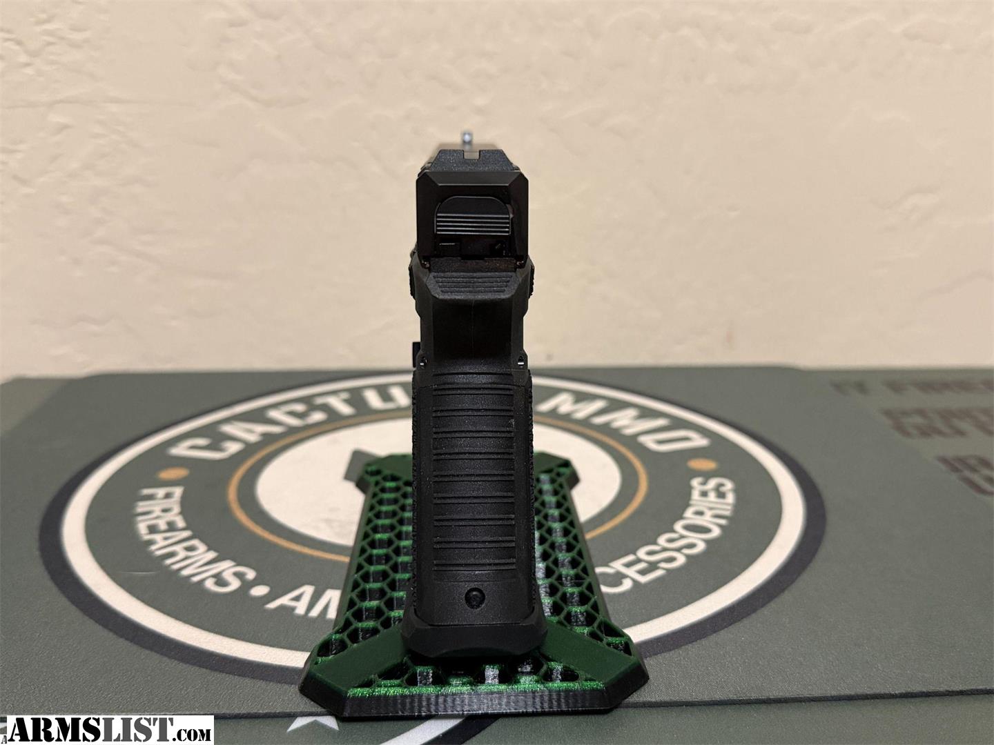 FEATURES: Proprietary rubber over mold contour grip with aggressive texturing providing a non-slip grip, shock absorption, vibration dampening and enhanced durability Serrations and index point on trigger guard to help control recoil Serrations on top of beaver tail reduce glare Flared mag well Thumb Accelerator pad Picatinny rail (not a Glock® rail) “MIL-STD 1913 Picatinny” High beaver tail with low profile bore axis Grip angle is the same as Glock® Slide stop guard Larger trigger guard for better access with gloves Recessed contoured mag release area for faster mag changes Multi caliber- Compatible with compact 9mm, .40 cal, .357SIG Mag Well compatibility – SCT 19 Magwell INCLUDED Three MagPul G9 Pmags included. SLIDE: