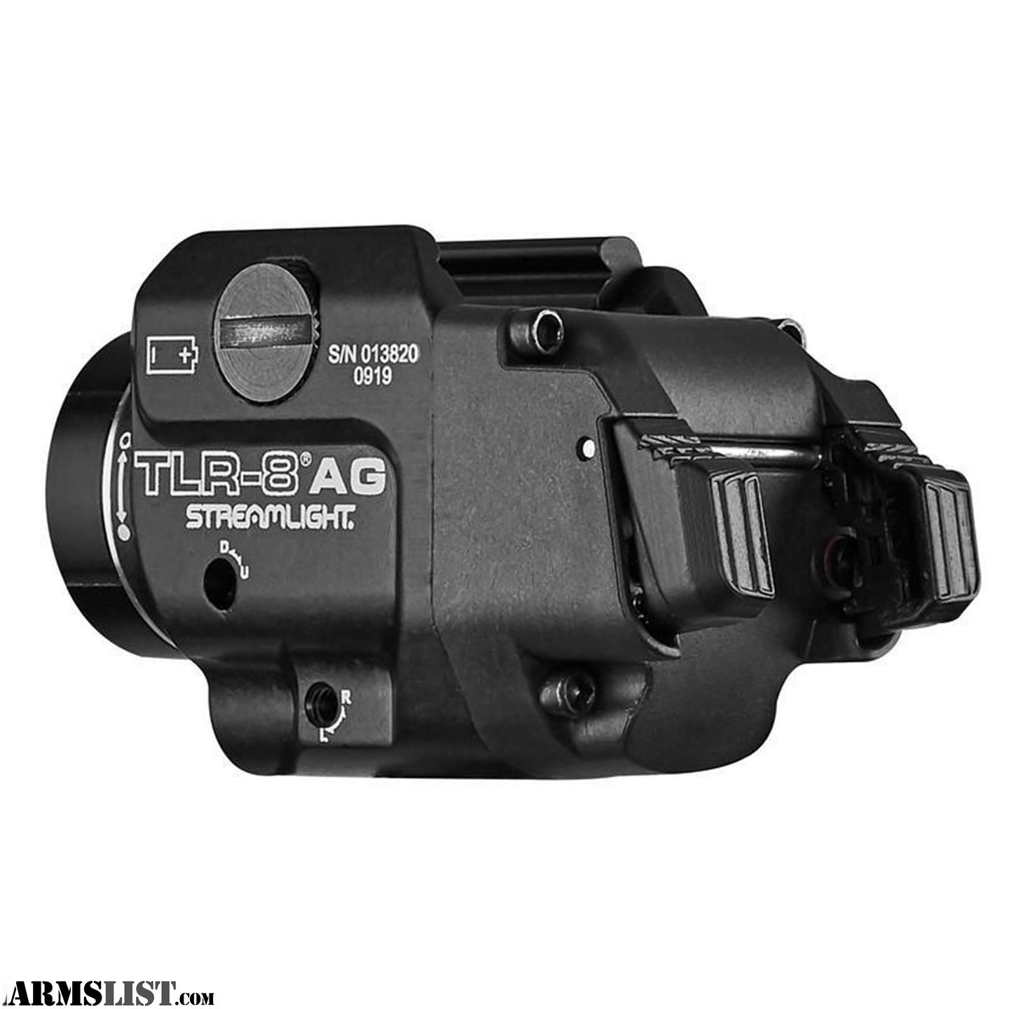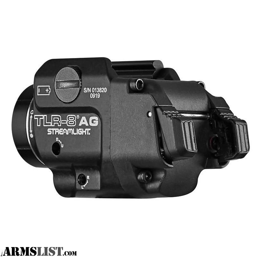 Streamlight TLR-8G Tactical Flashlight Features Fits a wide range of full-size and compact guns White LED AND 510-520nm Green laser Powered by one 3-volt CR123 lithium battery (included) C4 LED technology Output: 500 lumens Beam distance: 140 m Run Time: 1.5 hours (light only or light/laser combo); 11 hours (laser only) Low profile ambidextrous on/off switch - side or rear with high or low option Safe off feature to save batteries by preventing accidental activation Rail grip clamp system securely attaches/detaches quickly and safely with no tools and without putting your hands in front of the muzzle Durable, anodized machined aluminum construction User enabled strobe function Rail locating keys included Length: 2.15" Width: 1.18" Height: 1.50" Weight: 2.64 oz with battery IPX4 rated design Assembled in the USA Streamlight 69430 69434 Streamlight TLR-8G & TLR-8AG FLEX Tactical Gun Mount Flashlight has a Limited Lifetime Warranty against defects. Authorized Streamlight Dealer