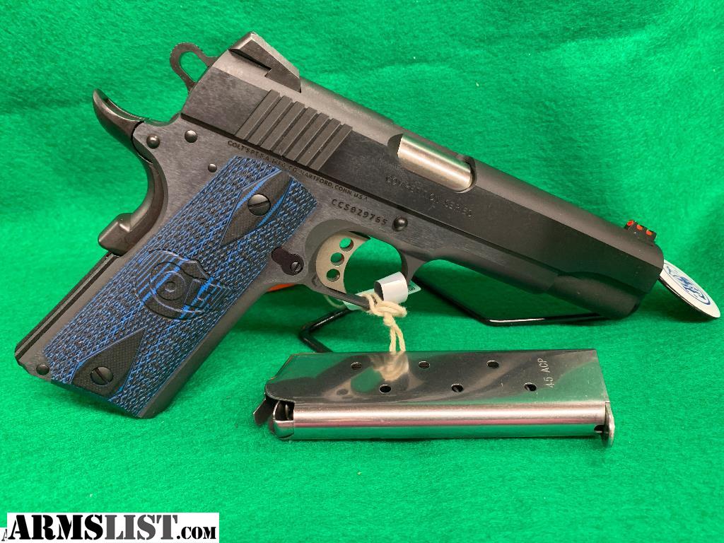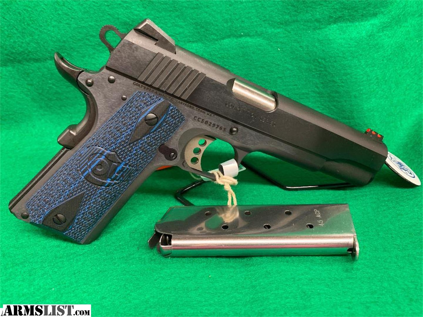 Colt 1911 Government Competition Series 45 ACP, 5" Barrel, (1)8 rd Mag, G10 Checkered Blue Grips, Novak Adjustable Fiber Optic Sights Pappy's Arms LLC 802-795-0054 pappys.arms@gmail.com