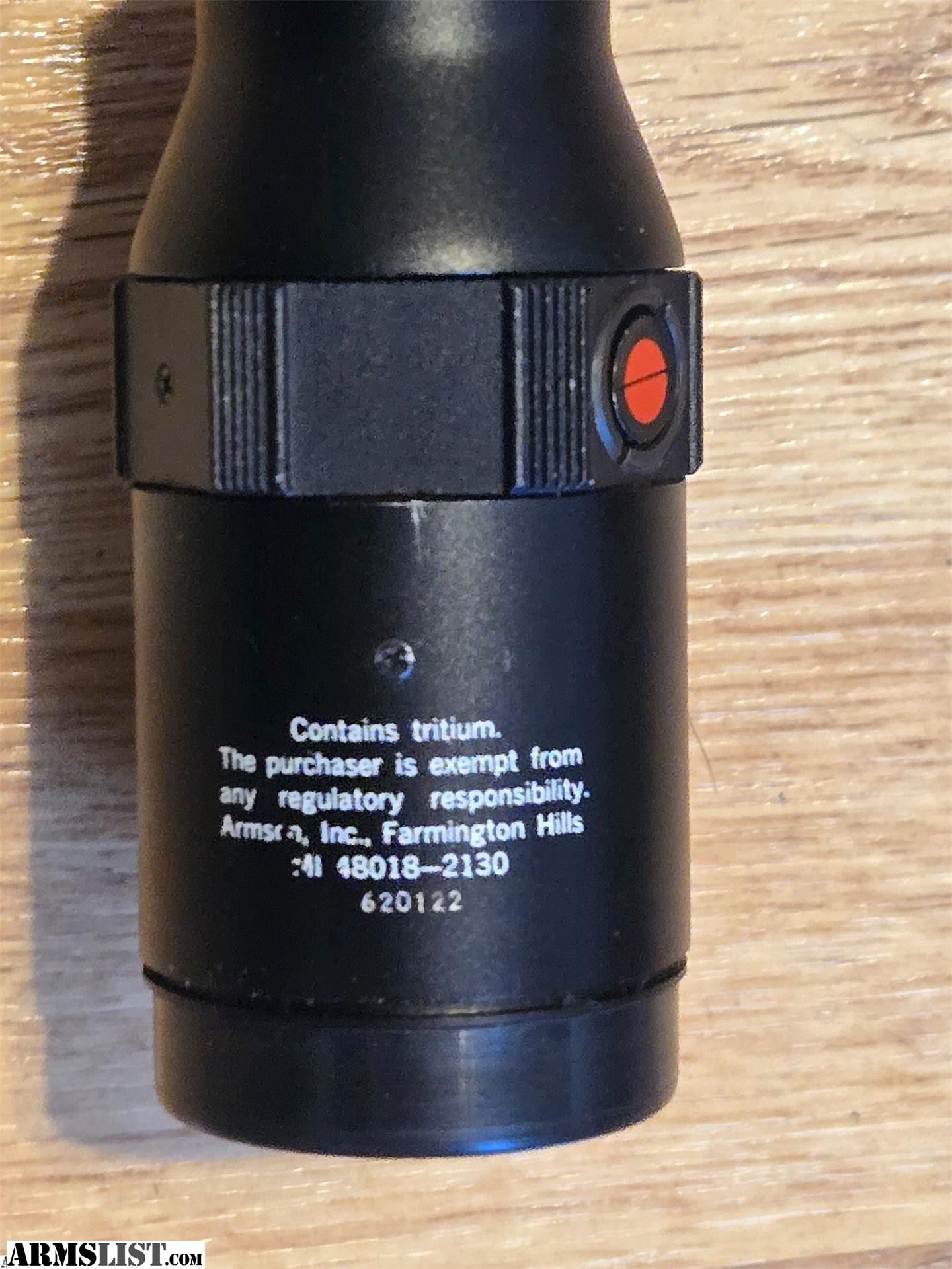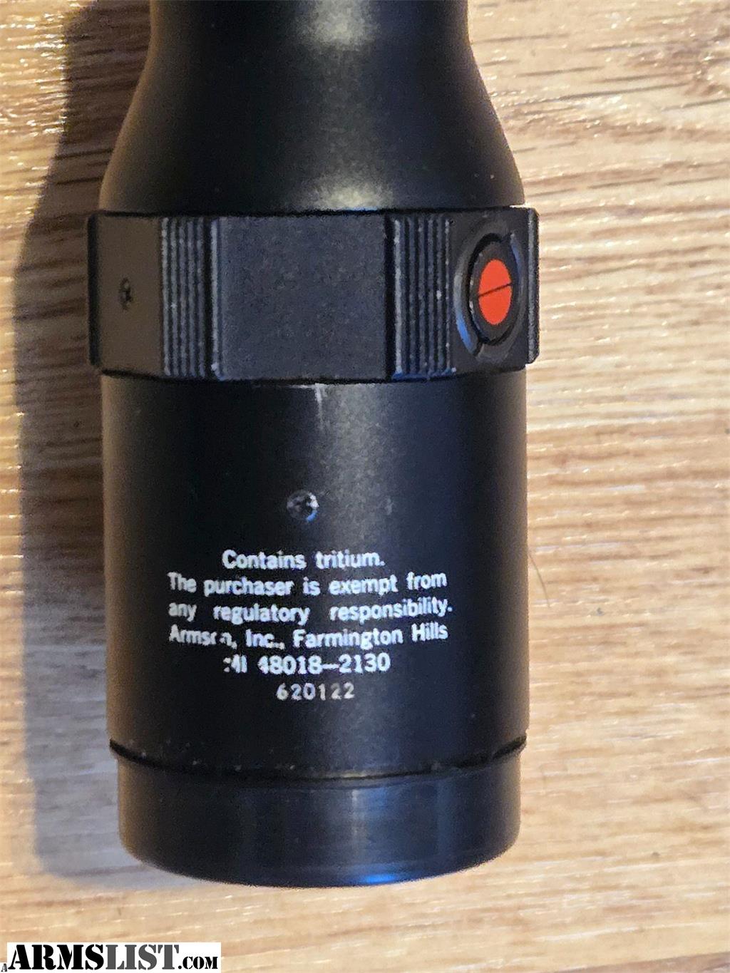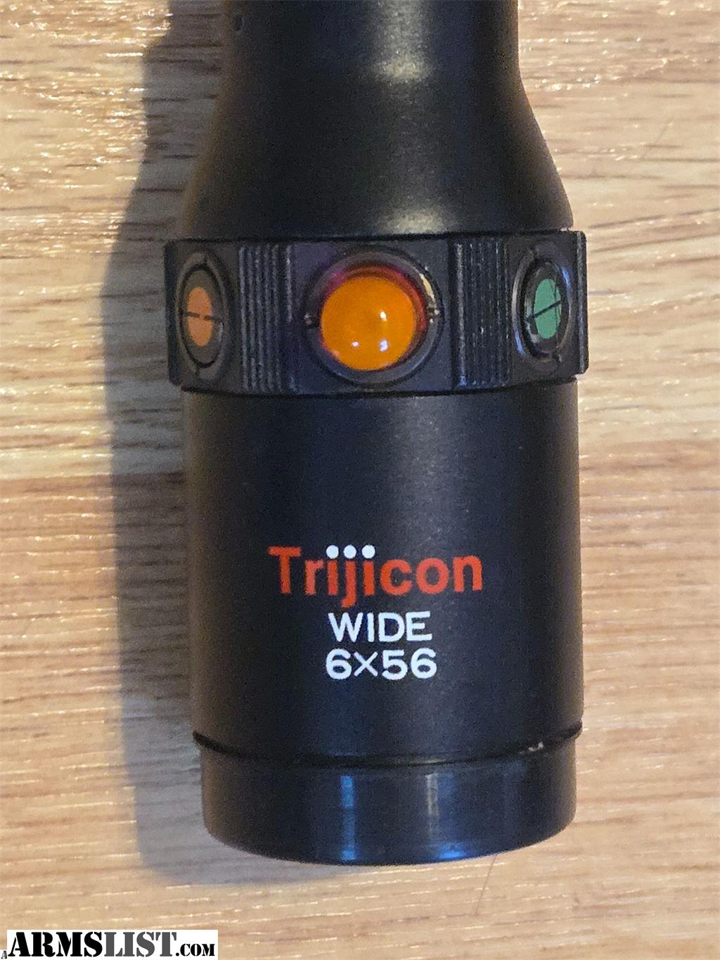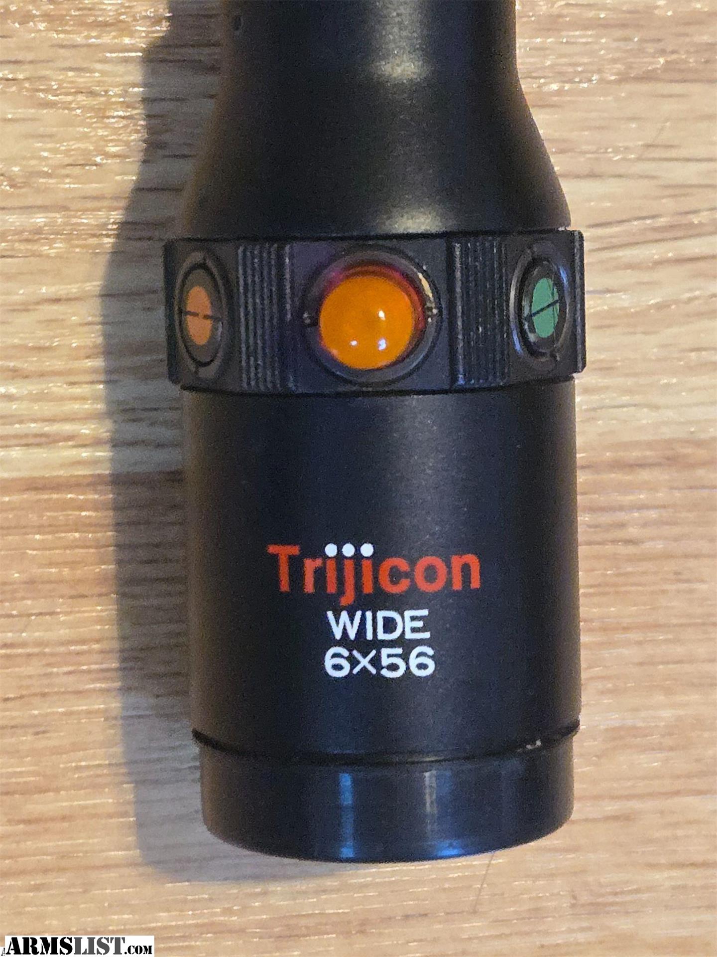 Trijicon 6x56mm scope. This scope is in beautiful condition. The glass is extremely clear. There are three different colors, red, yellow and green. The red is the only one you can still see. The reticle has a dot with two thin lines on each side and it can be seen at all times.