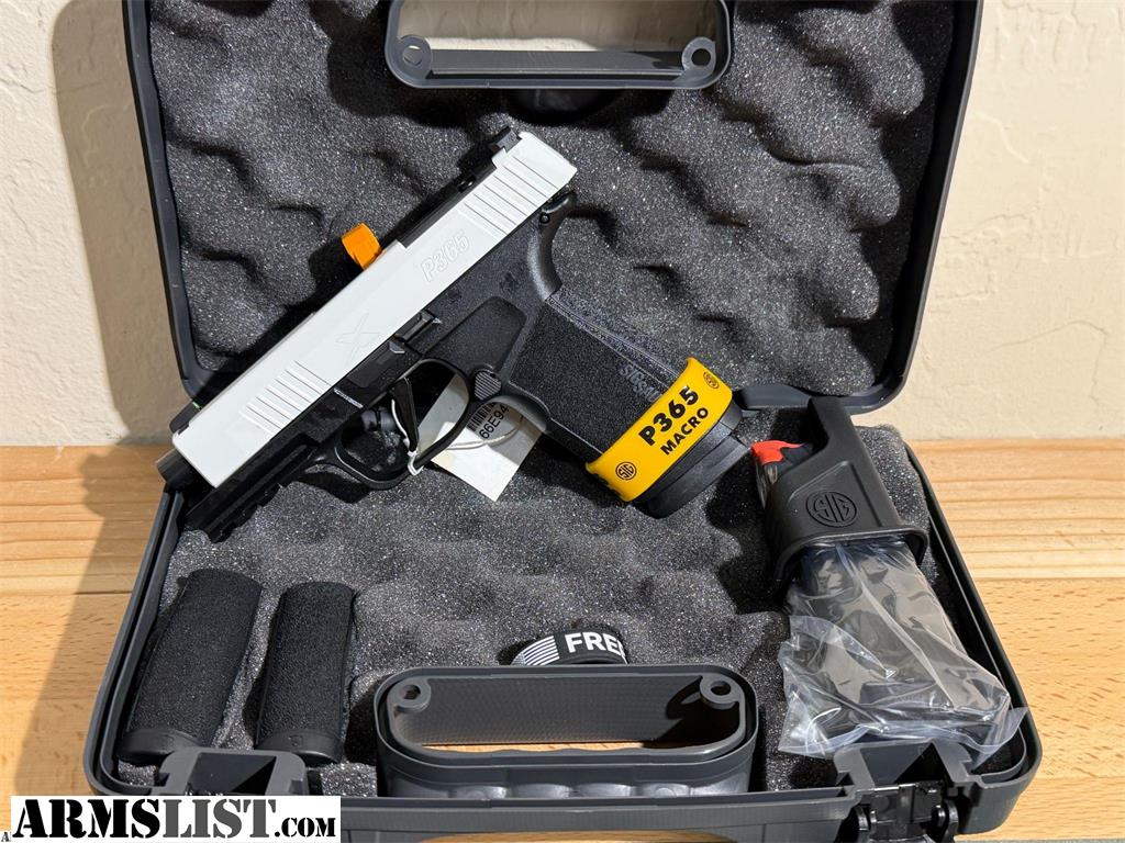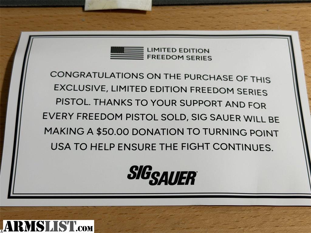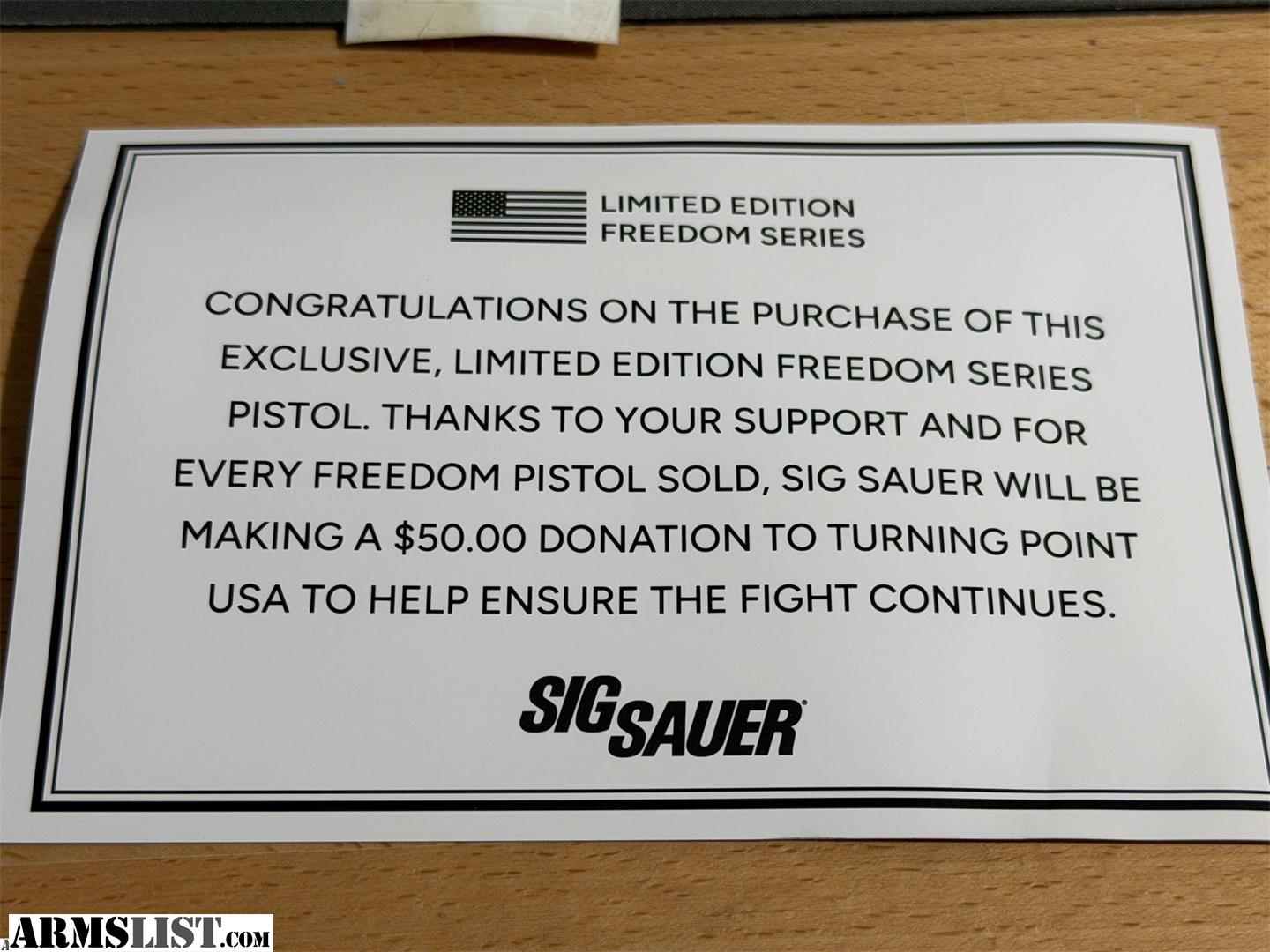 SIG SAUER will be Donating $50.00 to Turning Point USA for Each Pistol Sold Special ”Freedom” and Flag Engraving on White Cerakote P365 Optic Ready Slide XMacro Compact Grip Module 3.7” Barrel XRay3 Day/Night Sights (2) 17rd Magazines