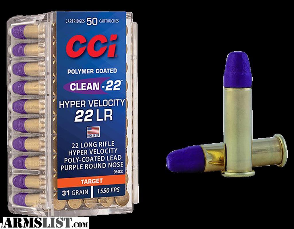 CCI Clean-22 22LR Hyper Velocity 1,550 fps Purple polymer bullet coating reduces lead fouling in the barrel without leaving residue Cuts lead buildup in suppressors 60 to 80 percent 31-grain lead round nose bullets Optimized bullet geometry for improved accuracy High-velocity loading and reliable function in semi-automatic firearms 500 Round Box Manufacturer Part #: 954CC UPC: 604544688870
