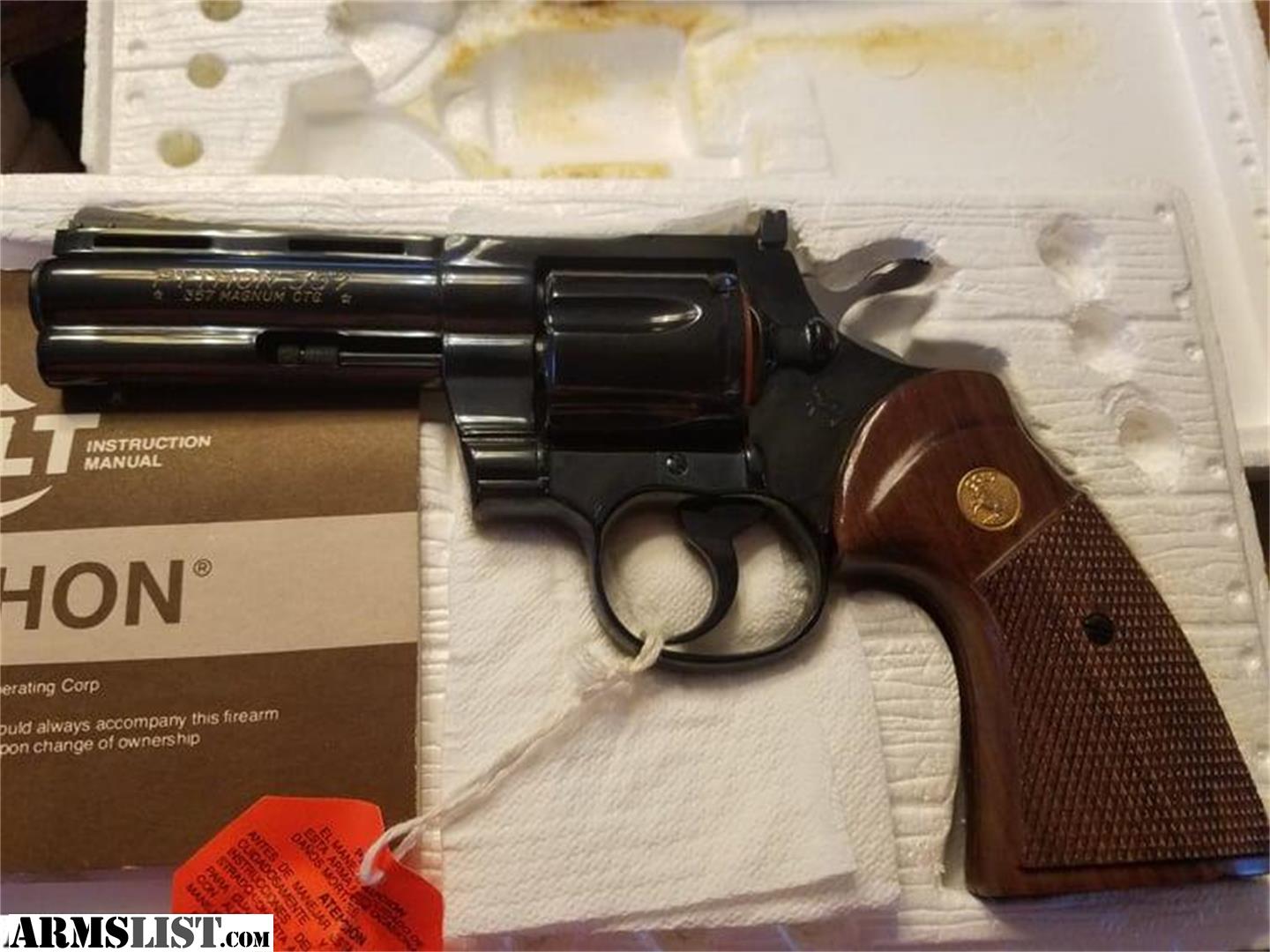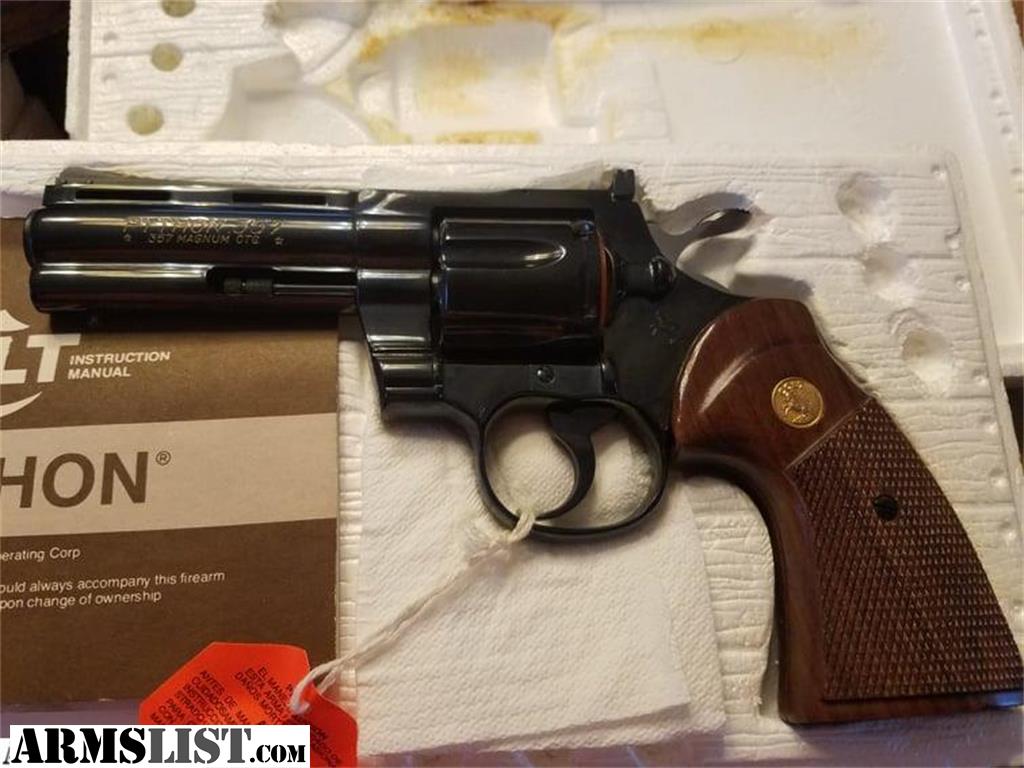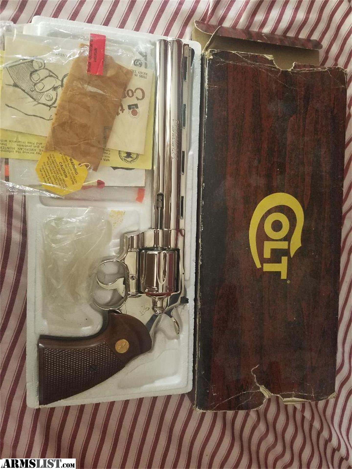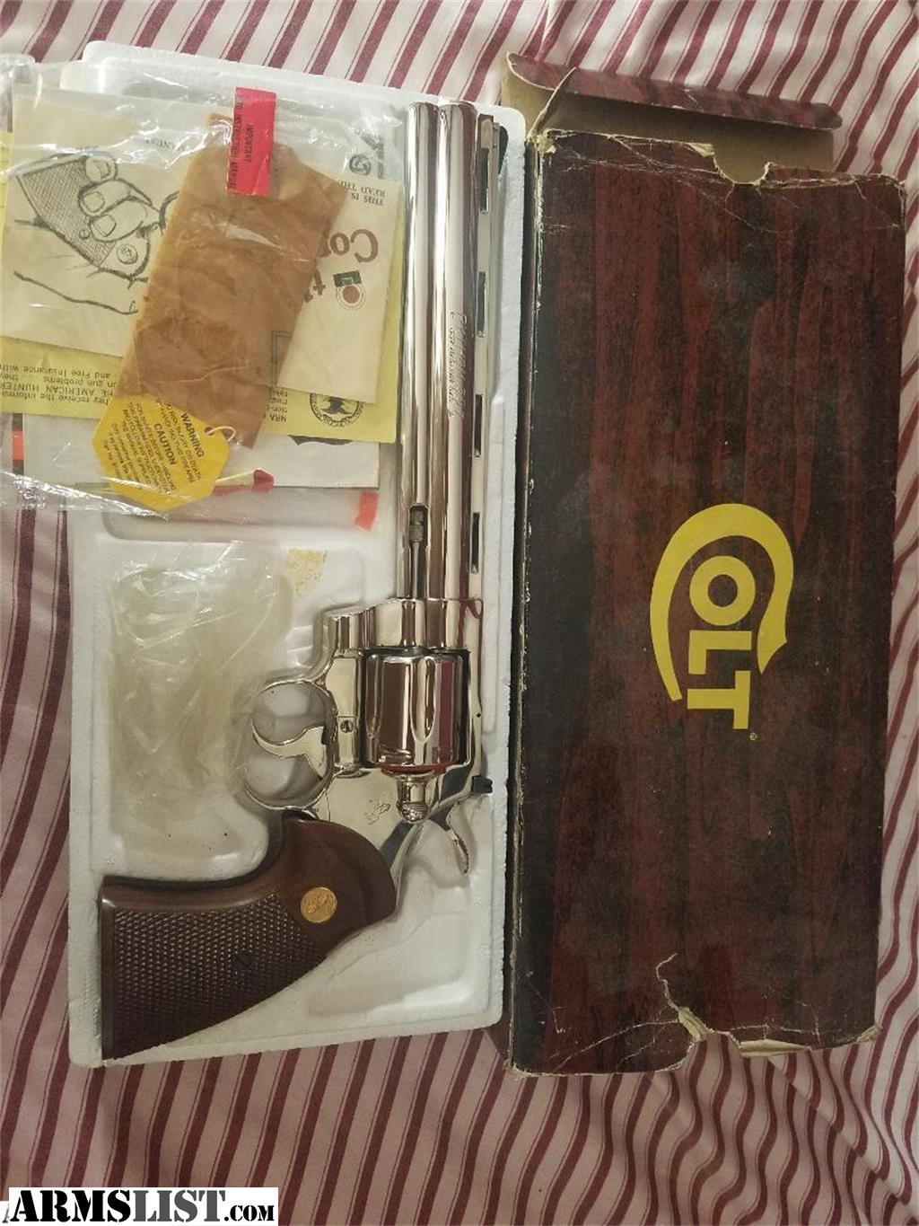 Colt Python 8'' 1981 in original box. unused, I cleaned off the cosmoline, I give 9.5% or better condition. Full Lug 8" barrel with ventilated rib nickel Python K48443 Two-pin black ramp front sight. Gold Colt monogrammed checkered walnut grips, brown wood-grained paper box with some crushing and tearing at the ends, with correct end label and manual, "Colt Companion" booklet, price list, and other paperwork. Original plastic handgun bag. More pix available. Payments, TD bank personal check/TD cashiers check or USPS postal money order for shipping, pick up will need to copy your driver's license and fill out the firearm bill of sale.