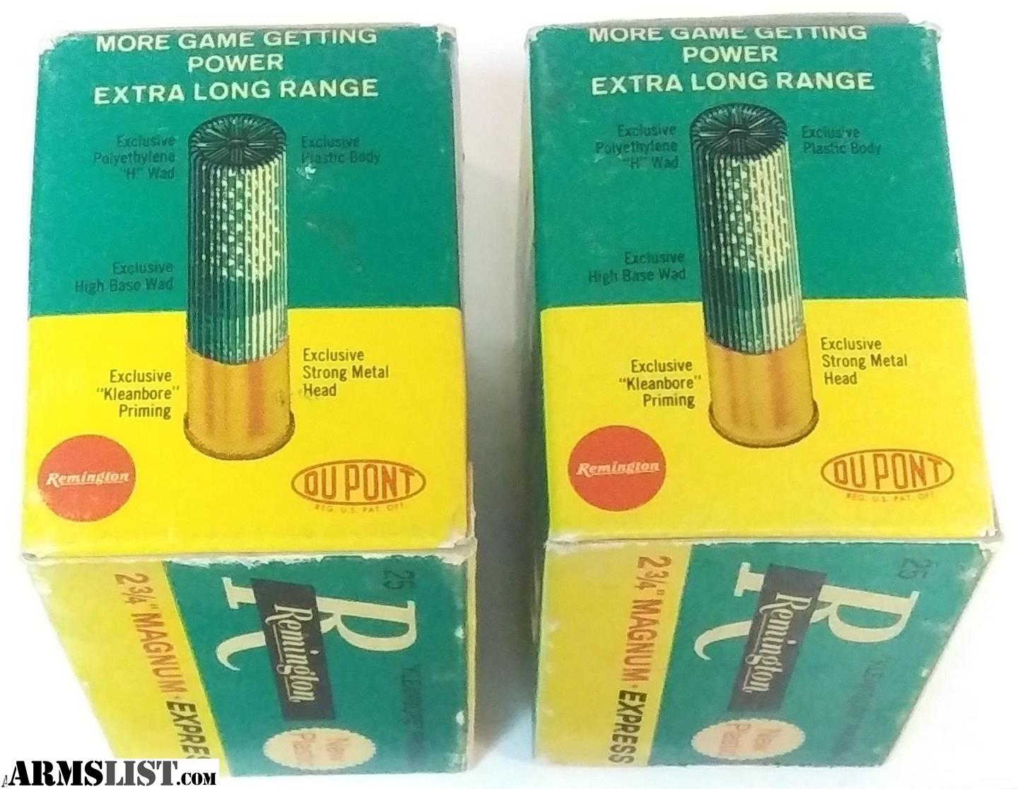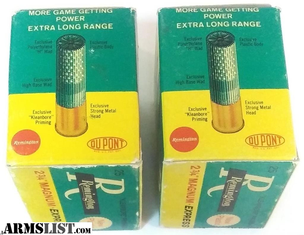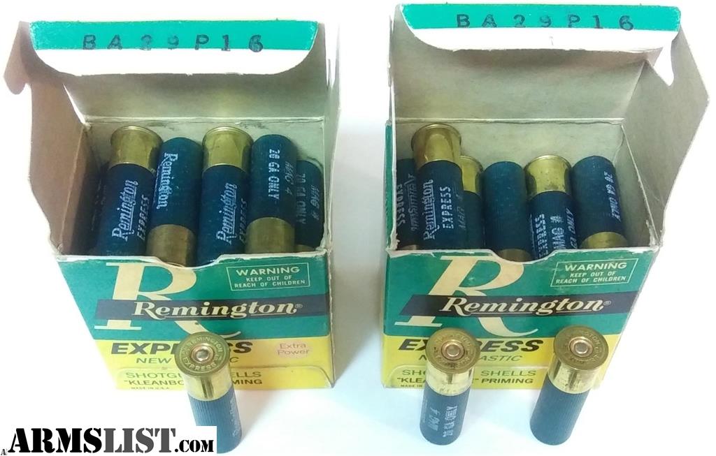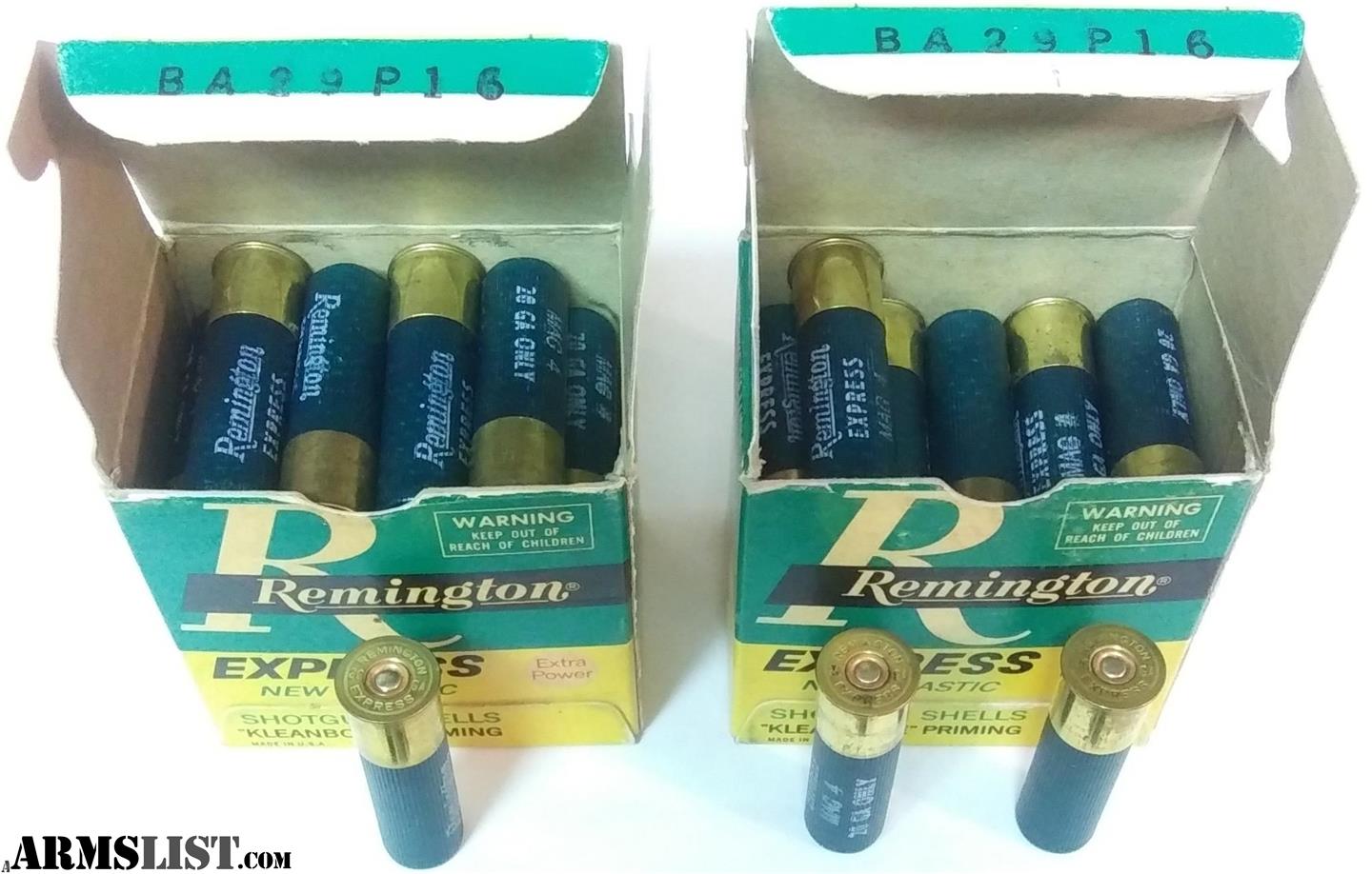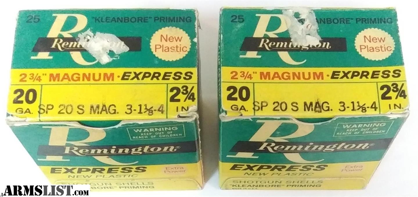 1 box of 25 shotshells. 1 box of 22 shotshells in 25-shotshell box. Lot No. BA29P16. Comes w/ 1 Remington Express 20-GA shotshell. Measured length: 2.1875". Measured weight: 42 g. In box w/ 22-count of 2 3/4" Magnum-Express shotshells. 48 plastic shotshells total. $0.73 / shotshell. Shotshells new, but in opened boxes. Boxes good condition. Unknown how all ammo have always been stored, or how old it is. All clean. List price total for all items. Sold as collectible ammunition.