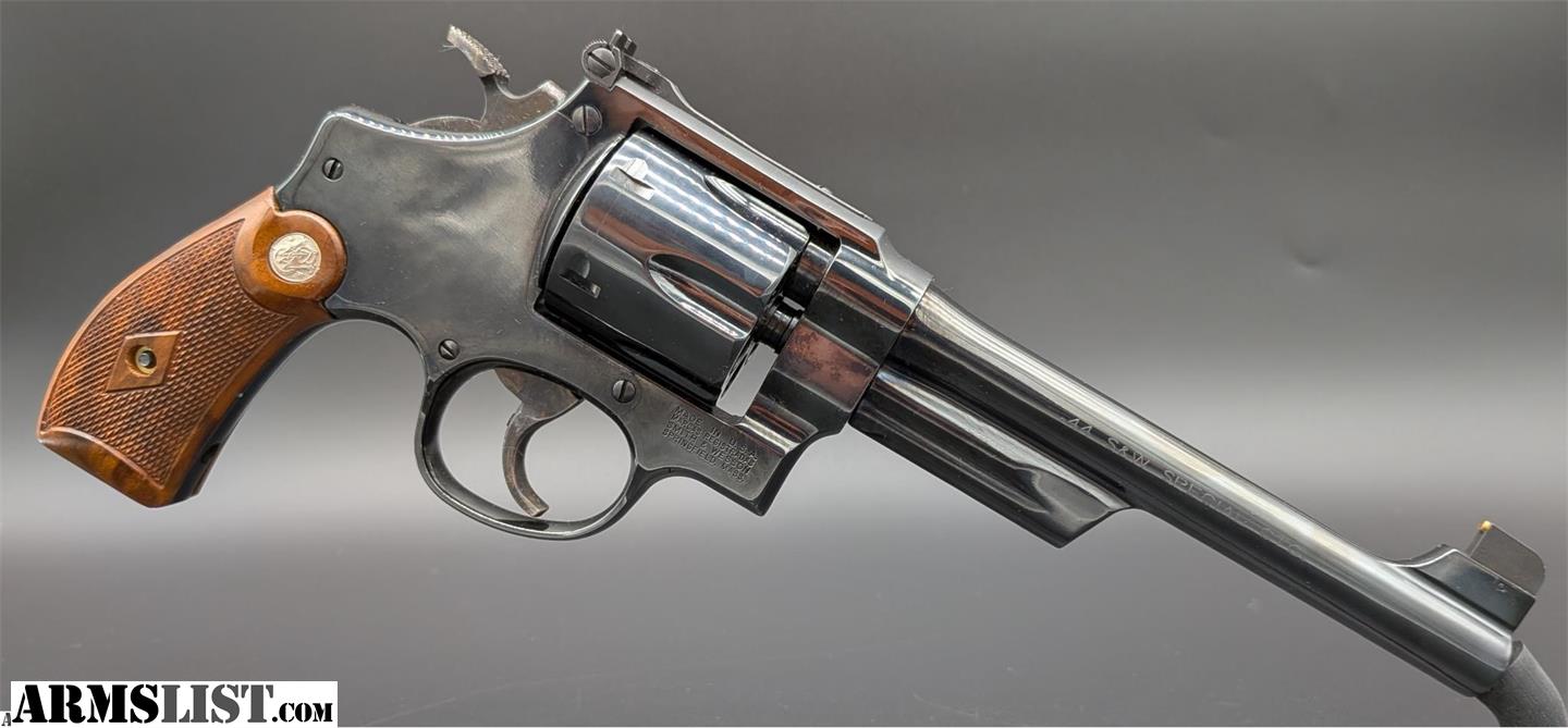 The frame and cylinder are finished in blue over carbon steel construction, complemented by brown checkered wood grips with Smith & Wesson medallions.