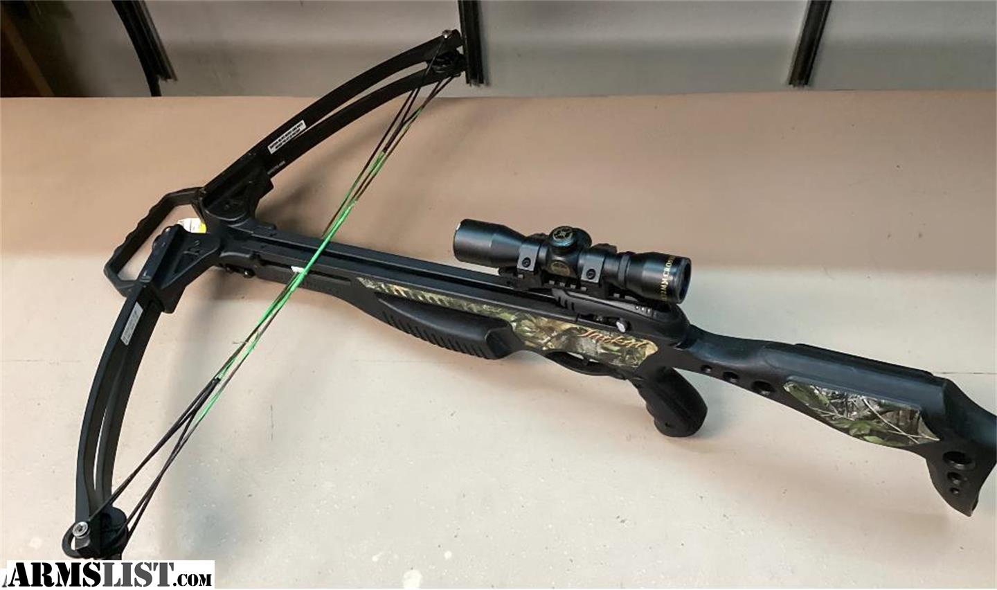 Pre-owned Barnett Jackal black/ camo crossbow with Barnett 4 x 32 scope.