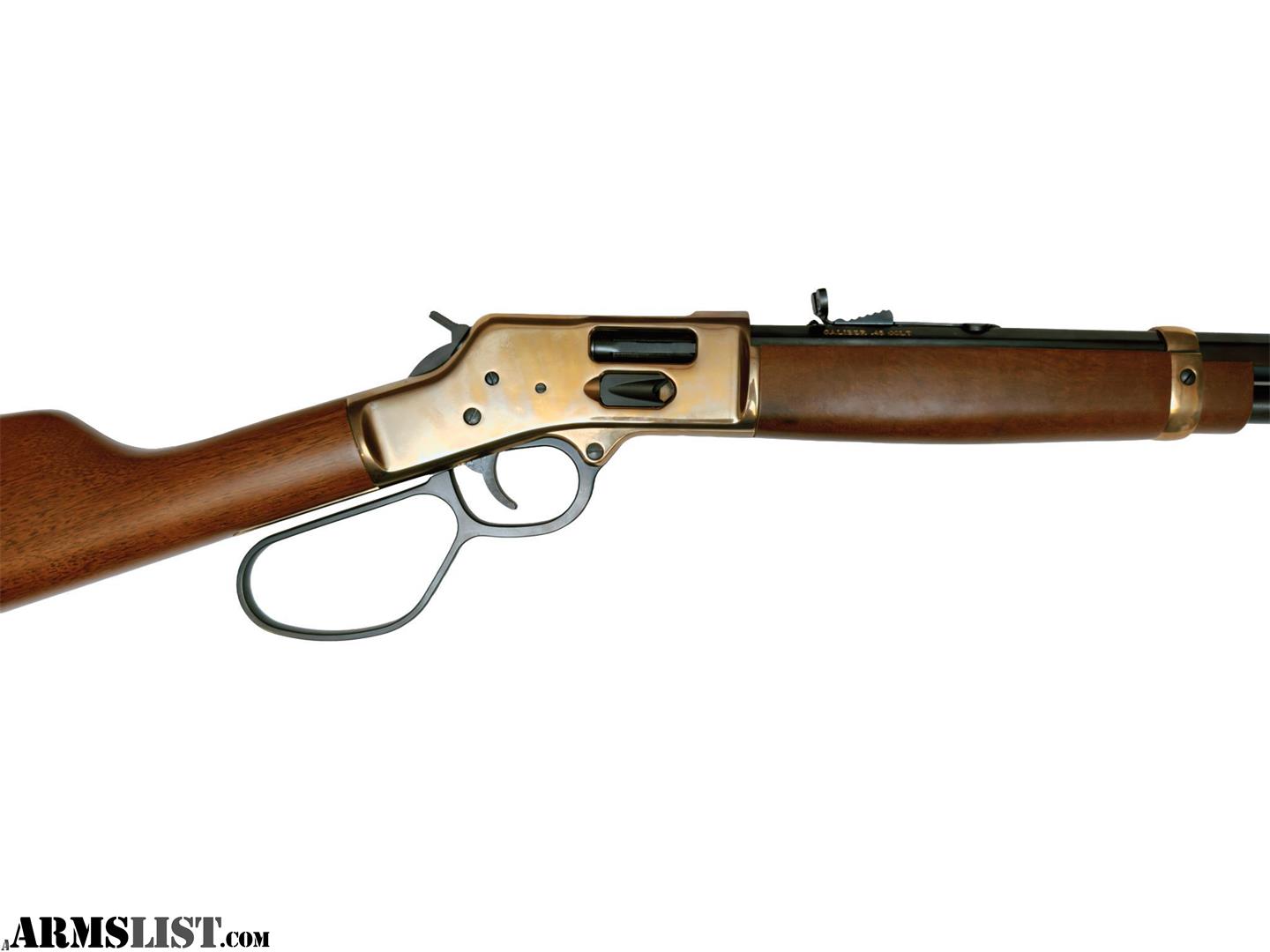 CHAMBERED IN .45LC 20" BARREL LENGTH 10+1 MAGAZINE CAPACITY OCTAGON BARREL SIDE GATE AND TUBE LOADING LARGE LOOP LEVER MODERN PRODUCTION HENRY NEW IN BOX FREE SHIPPING TO THE LOWER 48 CONTACT DEVIN OR BRYAN AT MOUNTAIN GUNS WITH ANY QUESTIONS