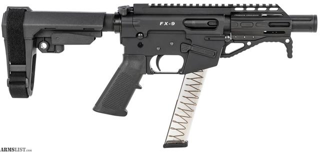 Freedom Ordnance, FX9, Semi-automatic, Pistol, 9MM, 4" Barrel, Faux Suppressor, Anodized Finish, Black, SBA3 Pistol Brace, Freedom Ordnance Angled Fore Grip, 32 Rounds